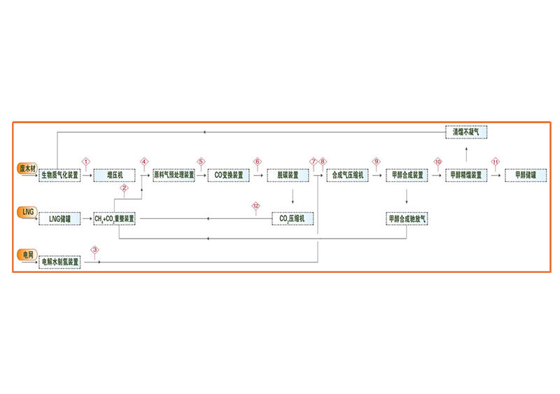 20000吨/年绿色甲醇项目,采用生物气化、甲烷+CO2重整、电解水制氢等工艺制取甲醇合成所需的CO、H2、CO2的原料气,原料气经过一系列的单元处理后, 采用一氧化碳加氢的方式合成甲醇,合成的甲醇用于船舶燃料或化学原料。